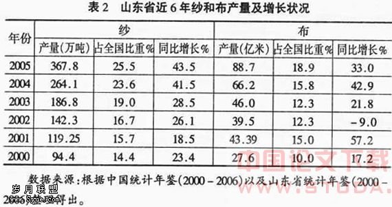 从上表可以看出,山东省纺织业在全国已经具有一定的竞争优势,而且从2002年第一个纺织业集群成立开始,纱和布这两种纺织业产品的基础原料增长速度较快,尤其是2004年开始增长十分迅速。山东省纺织行业以针织、服装、家用纺织品、产业用品等最终产品为龙头,紧紧围绕市场需求,积极调整产品结构,使得纺织区域经济发展很快;目前已被中国纺织工业协会授予的名城镇有即墨中国针织城、昌邑中国印染名城、诸城中国男装名城、海阳中国毛衫名城、文登中国工艺家纺名城、胶南王台镇中国纺机名镇、邹平中国棉纺织名城和周村中国纺织产业基地。可见山东省纺织行业的产业集群已形成,纺纱(毛纺)——织布(针织)——印染——服装(家纺)完整的产业链方式,这是其他省份所不具有的。