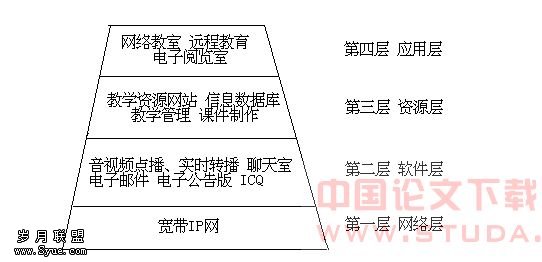 经过对网络教学系统的研究与实践,网络教学系统可以分为四层:即网络层、软件层、资源层、应用层。图3是分层网络教学系统示意图。