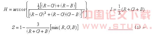 图1 RGB 颜色坐标系统 图2 HSI 颜色坐标系统从RGB坐标系统到HSI坐标系统的转换公式如下: