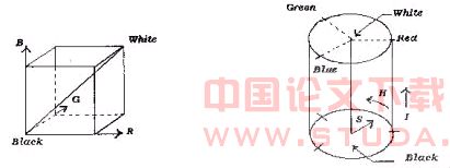 2.2 RGB和HSI坐标系统数字图像处理中,常用的颜色坐标系统有RGB和HSI坐标系统(坐标系统图如图1、图2)。RGB颜色坐标系统以红R、绿G、蓝B三种颜色为基色,其它颜色由这三种基色加权混合而成。HSI坐标系统中H表示色调(Hue),S表示饱和度(Saturation),I表示密度,对应图像的亮度(Intensity)。面向
