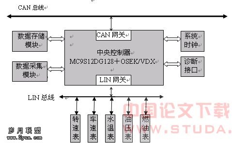 1.4 OSEK实现语言(OSEK Implementation Language)为了达到软件可移植的目标,OSEK OIL 规范提供一种在特定CPU 中配置OSEK 应用的机制。每个CPU对应一个OIL描述,所有的OSEK系统对象用OIL 对象来描述。OSEK 应用的OIL 描述是一组OIL 对象的组合,CPU 是这些OIL 对象的容器。OIL 明确地为每个OIL 对象定义了所有标准属性。每个OSEK应用可以定义附加的特殊执行属性和引用并限制每个属性的取值范围。OIL 中的对象包括:CPU (处理器) 、OS(操作系统) 、AppMode (应用模式) 、ISR ( 中断服务) 、Resource ( 资源) 、Task(任务) 、Counter (记数器) 、Event (事件) 、Alarm(报警器) 、Com(通信子系统) 、Message (消息) 、Ipdu (交互层协议数据单元) 、NM(管理)等。汽车API 标准的出现是在开发时间和降低成本、提高软件质量和模块的可移植性上迈进了一大步。不同的一致类、不同的调度模式和静态配置的特征保证了OSEK/ VDX OS 能广泛地运用在不同的场合,适用于不同的硬件。而OSEK/ VDX操作系统内核又不局限于汽车行业,充分说明了其强大的生命力。现在有很多提供符合OSEK/ VDX 的操作系统供应商,如WindRiver、Motorola、ETAS 、Sysgo、Accelerated Technologies 和Realogy 都在推动OSEK/ VDX的和应用。 2 汽车仪表信息系统汽车仪表是汽车中不可缺少的组成部分,负责记录并显示汽车的各种数据,其主要包括车速表、里程表、发动机转速表、油量表、气压表、电压表等(系统结构如图4所示)。其核心内容是实现汽车仪表及全车运行数据的数字化与信息共享。由图4可知,本系统主要由中央控制器、数据存储模块、数据采集模块和诊断接口等部分组成。仪表中央控制器是本系统的核心部分,主要任务包括数据收集、数据存储和管理分析以及数据交换。数字仪表及仪表板以具有LIN接口的仪表机芯为特征;所有仪表机芯均以Freescale公司的8位单片机为核心,实现步进电机、十字线圈、液晶、数码管以及LED指示灯输出。手持诊断设备具有大屏幕LCD及按键,通过自定义专用总线与中央控制器相连,主要功能包括:黑匣子数据下载、实时数据下载、配置数据交互,在线故障分析与诊断等。
