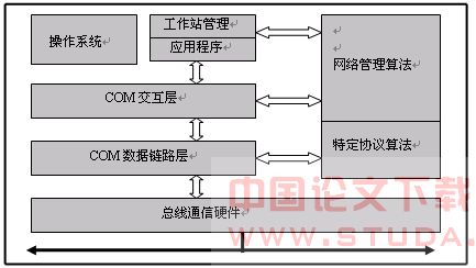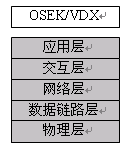 图1 OSEK OS在OSEK/VDX中的层次模型 1.2 通信COM(Communication)OSEK/VDX的通信COM定义了一个应用程序内或者应用程序之间进行任务间或者处理器之间通信的接口和协议。该协议提供标准API服务,每个标准都可以独立操作。通信力求独立于协议,并使其在任何环境下都能灵活运用。为了实现这个目标,OSEK/VDX建立了五层模型(见图2)。