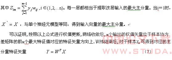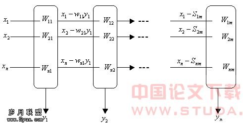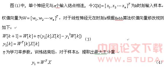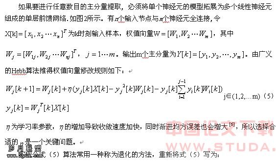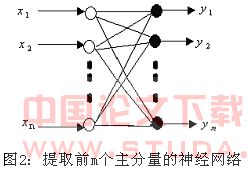 图3:提取前m个主分量的神经网络解析图3 识别系统特征参数以及模型3.1 语音的主分量特征参数(PCA特征)本文选用线性预测倒谱系数(LPCC)作为语音的原始特征参数然后对其进行主分量分析。LPCC系数是一种非常重要的特征参数。它的主要优点是比较彻底地去掉了语音产生过程中的激励信息,主要反映声道相应,而且往往只要十几个倒谱系数就能较好地描述语音信号的共振峰特性,因此在识别中取得了较好的效果。在实际中,LPCC参数不是由信号直接得到的,而是由LPC系数得到的。关系式如下: