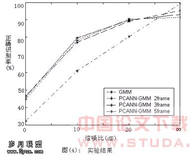 4 实验及结果分析本文实现了一个在噪声环境下与文本无关的说话人自动识别系统。使用的是一个含20人的语音数据库,包括10名男性和10名女性,每人语音长度约90秒。采样率为12kHz,采用16bit量化。首先对数据进行预处理,包括端点检测、预加重(H(z)=1-0.95 )和加窗(Hamming窗,帧长20ms,帧移10ms)。原始特征选为12阶的LPCC倒谱参数,主分量特征个数选12阶。高斯模型混合数M=16。训练音长为40s,测试音为3s。实验结果如表(1):表1 实验结果(%)| 信噪比方法 | 0dB | 10dB | 20dB | dB |