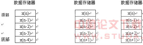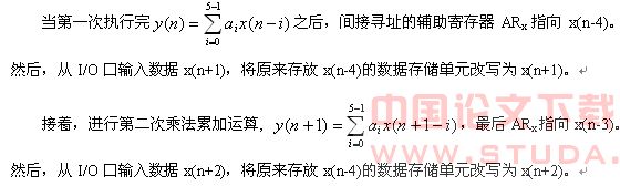 AH,AR2和AR3减1。 (6)保存和输出结果。 (7)修正数据指针,让AR2和AR3分别指向新循环缓冲区中最老的数据和旧循环缓冲区中最老的数据。 (8)用新循环缓冲区中最老的数据替代旧循环缓冲区中最老的数据,旧循环缓冲区指针减1。 (9)输入一个新的数据替代新循环缓冲区中最老的数据。 重复执行第(4)至(9)步。 在编程中要用到FIRS(系数对称有限冲击响应滤波器)指令,其操作步骤如下: FIR Xmem,Ymem,Pmem 执行 Pmad