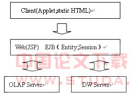 ⑴ 数据定义及读取主要完成定义数据仓库的数据源和数据提取规则或模型等数据仓库内容、结构和环境定义。⑵ 分离出数据源,验证数据的一致性,将不一致的数据按照统一的规则进行结构与域的变化转换。⑶ 质量保证对转化完的数据进行数据完备性、数据间的约束关系、数据的一致性、安全性和时序性等方而的检查及修正。⑷ 加载将提取的数据装入目标数据库,完成数据索引,目录维护等内容。3.4数据仓库的查询 前台查询系统负责数据的展现,它包括日志查询、MDX(多维语言)查询以及可视化界面查询等。在建立起服务器后台的立方体之后,可以通过SQL Server 2000 OLAP服务器建立后台数据和所需要连通的外部应用程序之间的连接。Microsoft SQL Server Analysis Services为多维数据仓库输出提供了编程接口:决策支持对象[4](Decision Support Object)。MDX查询可以被集成到使用DSO的程序中,被用于编程访问多个维度。系统的前端采用JSP技术实现报表的发布,有效减弱了业务逻辑接口和数据接口之间的耦合。同时,很好地分离了各模块的角色和责任,有助于提高代码的可重用性和灵活性。系统提供了多种查询统计分析界面,包括基本的查询统计、二维动态查询、多维展现、各种固定报表输出等。考虑到用户的需求,利用J2EE技术开发的基于浏览器/服务器模式(Browser/server,简称B/S)的数据服务平台系统,实现了数据仓库中的数据在internet上的共享,用户使用浏览器就可以方便快捷地查询、分析。