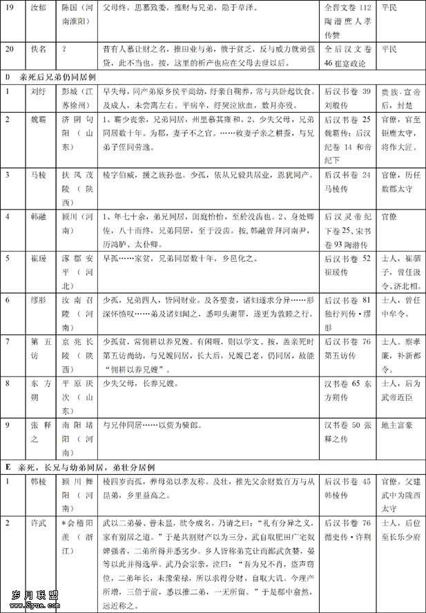 从上表罗列的事例看,兄弟同居大多是在父母或母亲健在的情况下实行的。表中6类同居家庭,C类“亲在兄弟同居,亲死兄弟分居”的实例最多,而且是家庭成分唯一包括了贵族、官僚、土人、地主富豪和一般平民在内的一个类型。可见,亲死兄弟分居析产是被社会认同的带有普遍性的规则。所以薛苞亲死服丧后,“弟子求出居,苞不能止”(C13)。表中E2许荆例,以往论者多视为汉代士大夫仍实行“生分”之证,但从有关分家事宜都是许荆一个人说了算看,父母已不在世,这应是父母死后兄弟同居,“二弟年长”后分居之例。当时上虽未禁止“生分”,但不能说“生分”是符合当时的道德规范(“礼”)的。许荆之所以受到舆论的谴责,不是由于分家,而是由于在分家中多占财物;而二弟由此获“克让”之名而“并得选举”。可见,许荆的分家不是“生分”,“礼有分异之义,家有别居之道”中的“分异”和“别居”也不是指“生分”,而是指亲死后兄弟的分居。为了与“生分”区别,则不妨称之为“死分”——这是符合通行的分家规则和公认的道德规范的。我们还可以看到,在D类“亲死后兄弟仍同居” 的9例中,7例是“早孤”[2]或幼小丧亲者。由于父亲早丧,诸弟尚幼,长兄代行父亲的职责抚养诸弟,实行兄弟同居。这时的同居,并不属于成年兄弟同居。在幼弟成年后,往往就要分家,如表中E类(“亲死,长兄与幼弟同居,弟壮分居”)之例,它实际上只是B类(“亲在兄弟同居,亲死兄弟分居”)的变例。也有幼弟成年后仍然维持同居的,这或因长兄已年迈需要抚养(如表中D7、D8例),或因长期生活建立了感情(如表中D1例),或因恪守儒家道德规范(如表中D2、D6例)[3]。这类家庭虽然被树为道德的楷模,但政府并没有作硬性规定,亲死后兄弟仍然同居不构成普遍性的规则。兄弟妯娌之间不可避免的矛盾,也使它难以普及和稳定地维持下去。D7缪肜亲死后兄弟同居共财,“及各娶妻,诸妇遂求分异”,应视为正常合理的要求。E3戴昱“年六十二,兄弟同居二十余年”,后“为宗老所分”,应该就是长兄抚养幼弟成长后,宗老根据惯例让他们分家的,戴昱本年身不乐意也没有办法。亲死兄弟分家,或亲死弟壮兄弟分家应是常例,亲死弟壮后兄弟仍然同居只是特例,不过,由于它符合儒家“昆弟之义无分”的教义受到表彰,反而更多被记载下来了。