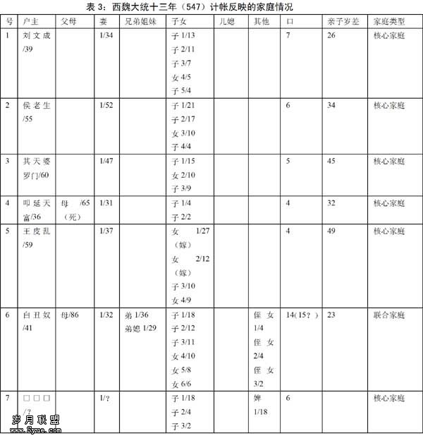 表2中1号和3号户主,4号和5号户主,6号和7号户主可能分别是兄弟。从3号户为联合家庭看,1号户和3号户应是从一个联合家庭中分裂出来的。6号的随嵩和7号的随扬可能是异母兄弟,随嵩生母早丧,其父续弦,生随扬,随嵩成年后分出,随扬则与其父母(生母)同居。如果这种推测不错,则这是实行“分异”规则的实例。