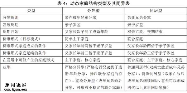 家庭结构变化的机制,或者说制约家庭结构演变的主要因素,就家庭自身而言,应该是分家制度或分家规则。我国战国秦汉以后实行诸子析产均分制,在这一基本制度下,分家规则主要有两种:一种是父母在世时儿子成年即行分家,实行这种分家规则所形成的动态变化的家庭结构,可以称之为“分异”型;另一种是父母在世时兄弟同居、父母去世后兄弟分家,实行这种分家规则所形成的动态变化的家庭结构,可以称之为“同居”型[1]。“分异”和“同居”都是我国上存在的名词,并非舶来品,但我们用它们来命名这两种动态的家庭结构时,赋予了它们特定的含义,这里的所谓“分异”和“同居”是用以区分父母在世时成年兄弟是否分家,而非泛指。这种家庭结构的分类着眼于家庭结构的动态变化,它并不排斥和替代“核心家庭”、“主干家庭”、“联合家庭”的分类,而更有利于揭示这些家庭形式之间的相互关系。“分异”型动态家庭结构排斥联合家庭,它以简单的主干家庭为标准形式,在其发展中除复制主干家庭外,还派生出大量的核心家庭;主干家庭和核心家庭相互依存和相互转化。“同居”型动态家庭结构则以成年兄弟同居的联合家庭为其标准形式,在其发展中同样派生出相当数量的核心家庭,而它的复制一般也要经历从核心家庭、主干家庭到联合家庭的过程;联合家庭、核心家庭和主干家庭相互依存和相互转化。现实生活是复杂多变的,这两种动态家庭结构中不同的亚型或过渡形态。例如,虽然实行亲在成年兄弟分家的规则,但不一定严格在庶子到达成婚年龄时分家,而是在婚后分家,这样就可能形成暂时的、不稳定的联合家庭,相对于严格的分异型,可称为“宽松分异型”。又,兄弟同居家庭一般在亲死后分家,但也有亲死已婚兄弟继续同居以至形成四代以上累世同居家庭,相对于普通同居型,我们不妨称之为“特殊同居型”。为了醒目起见,我们把两类动态家庭结构的同异列为下表: