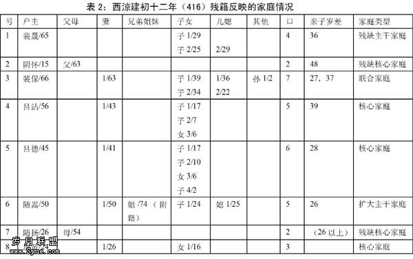 西涼建初残籍和西魏大统计帐是人们经常用来研究魏晋南北朝下层社会家庭情况的材料,兹分别列表如下并予以分析[8]: