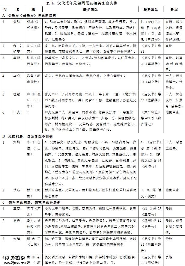 兹把检得的两汉成年兄弟同居及相关家庭的实例列为下表: