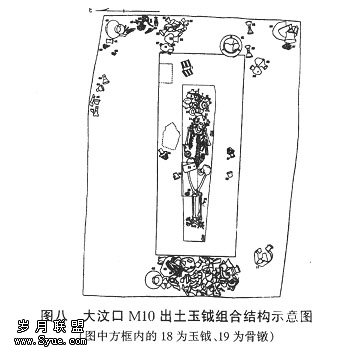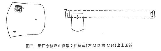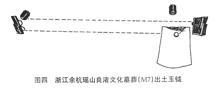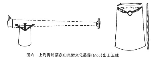 瑶山共有玉钺6件,出土于6座墓中,每墓仅出一件,也是大型墓,形制特点与反山玉钺相同,从M7中出土的玉钺复原看,柄通长80厘米(12)(图四)。