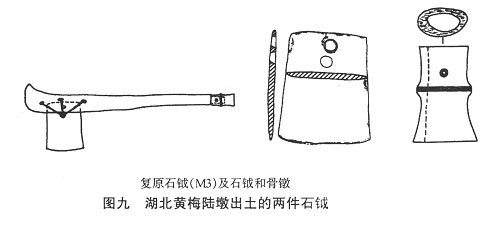 湖北黄梅陆墩出土并复原石钺2套,出于两座二次葬墓,一为中年男性,一性别不明,每座墓的随葬品有十余件。其中石钺由钺身和骨端饰组成,没有发现钺冠状饰,钺身高17.9、宽13.6、厚0.9厘米,复原的全长约66厘米(17)(图九)。