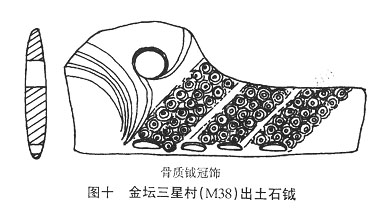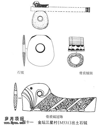 澄湖古井带柄石斧、青墩带柄陶斧的出土首先解决了石斧的结构和装柄问题,良渚文化玉钺的出土与复原进一步明确了钺的一般结构,为探讨玉钺的功能提供了依据。随着玉钺的大量发现及研究的深入,玉钺的渊源问题引起关注,就外形分析观察钺是起源于石斧,从石斧逐渐演化而来,但一直缺少这方面的实物资料,往往是就石斧头造型特点分析论述。1993—1998年在江苏金坛三星村遗址出土了两套结构复杂、造型基本相同的石钺,第一次明确、可靠地证实玉钺应源于石钺(18)金坛石钺分别出于两座墓葬中(M38、M531),需要说明的是在该遗址发掘的千余座墓葬中,出土如此精美石钺的墓并不是规模最大、随葬品最多的墓葬,似说明有其特殊的意义。M38是一中年男性,单人仰身直肢一次葬,随葬品有石钺l套3件、陶尊l、陶罐l、陶鼎 l、砺石1、骨器2、鱼骨等。其中石钺位于墓主左下腹,由石钺身、骨质帽饰、牙质镦及木质柄(残缺)组成,钺身平放在上部,刃口朝外,墓主手握柄部中段,镦在下部,全长53厘米(图十)。M531是一青年男性,单人仰身直肢一次葬,随葬品有石钺l套3件、陶鼎l、玉块l套2件。石钺的组合结构和出土位置与M38相同,全长45厘米(图十一)。钺身呈环刃舌形,顶部弧平,中上部有双面钻孔眼,通体磨光,刃口多完好未见使用痕迹。 M38钺身稍显粗糙,高12.4、宽9.4、厚1.9厘米;钺帽饰保存完整,侧面观呈鳄鱼首形,体扁薄,前部低矮,后部呈弧状凸起,后部偏上有一圆形大孔,器形前后端斜直,底边平直,在底边中部等距离分布四个半月形穿孔,器体两面纹饰对称分布,分前后两部分组成,前半部斜向分布三组圆圈纹,每组由三小排构成,排列规整,后半部有弧形凹纹,长10.5、高5、厚0.75厘米;象牙质镦(柄端饰),雕刻线条流畅、制作精良别致,通体呈鼓状,上下端平整,侧面外鼓,纹饰分四组,前后左右对称分布,前后是巨目枭首正面纹,左右为喙部外凸的立体鸟首纹,尤以眼部传神逼真,上端中部有一圆形凹坑便于容纳木柄并有一小圆形销孔贯通前后,器表磨光,高3、宽5.2厘米(图十)。M531结构与M38出土的套装石钺完全一致,帽饰、镦的纹饰稍简单,钺身为扁薄环刃舌形,器表精磨并抛光,高14.8、宽12.7、厚1.25厘米;骨质钺帽饰的形状特点及纹饰与M38钺帽饰基本一致,长12.3、高4.6、厚0.5—0.4厘米;骨质镦呈贯通的圆管状,两端乎整,骨壁较厚,内外壁均经加工并磨光,外壁上部刻有六道等距凹槽纹,下部刻有相对应的半月形纹一组,通体经抛光,高3.3、直径3.5—3.9厘米(19)(图十一)。