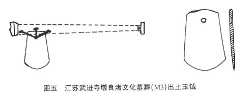 寺墩M3出土可复原完整玉钺l套,位于墓主上半身左侧,由钺身、冠饰、端饰及木柄(?)等部分组成,通长68厘米(图五),钺身为狭长梯形,弧形顶,侧边平直,双面弧刃,近顶部有一穿孔,通体精磨拋光,长19.5、宽13、厚O.6厘米。M3墓主是一20岁左右的青年男性,出土随葬品124件,以玉琮、璧、钺等最具特色,另外有少量的石质生产工具和陶器(13)。