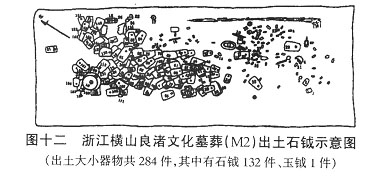 人类社会的发展必须有一定的基础,人类首先要解决生活资料的生产,早期阶段尤为重要,可以说此时的一切活动都将围绕生产展开,而在所有的生产活动中又以农业生产的地位最为重要,发达、稳定的原始农业可以为人们提供可靠的生活来源,农业的水平还决定着社会群体的规模,不难想象在生活没有基本保证的情况下社会是不可能向前发展的。原始农业的发展除受环境、气候等自然因素制约外,劳动工具的发展水平在这一过程中起有十分重要的作用。新石器时代遗址的考古发现一再向我们展示出这样的信息:文化发展水平与农业生产工具存有十分密切的关系,从早向晚期发展这一现象日趋明显,在早期墓葬中随葬品的组合上可以看出,除生活用具(陶器)外,常伴有生产工具(农业、手)出土,到新石器时代晚期阶段,随葬劳动工具的情况尤其显著,并分化出礼器性质的农具,说明原始农业在人们生活中的地位非同一般。例如:1993年4月中旬,浙江省余杭县文管会在横山清理的两座良渚文化墓葬(MI、M2)中都发现了大量的石钺和少量玉钺(图十二)。一号墓,残;出土石钺23件、玉钺l件及玉琮、玉璧、小型玉饰等共107件。二号墓,保存完整;出土陶器1件、石钺132件、玉钺l件及小型玉饰等共284件。两墓都有很多的石钺出土,是迄今为止良渚文化墓葬中出土石钺最多的,“这些石钺在制作上均未开刃,亦略显粗糙,显非实用器”(22),无疑是具有礼器性质的器物。