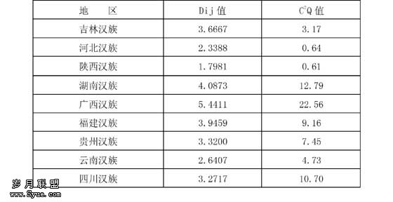 现代体质人类学的比较研究成果表明①:藏族在体质上Dij值和O2Q值与我国陕西和河北的汉族最接近。见表2。