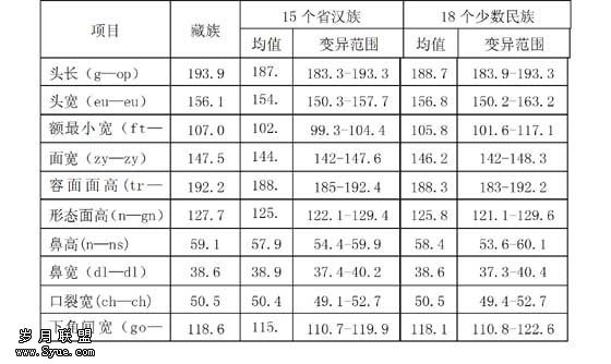 再看藏族各项测量值与汉族和其它少数民族之比较表来看(见表1):藏族头面部主要测量项目的均值与现代包括不同地区汉族和少数民族的中国人相同项目均值及其变异范围相比,大部分均值都在现代中国人的变异范围之内,它证明藏族是中国人,藏族的体质特征从总体上讲与现代中国人的体征明显属于同一个种族类型——蒙古人种的东亚类型。