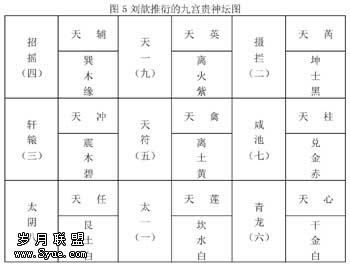 后来,汉代的刘歆的推衍,就把河图跟五行、阴阳、八卦等一系列思想哲学的范畴统一起来,长时期成为最有影响的思想,对各兄弟民族发生影响。相信“河图”与“九宫”传到西藏是吐蕃时期,可以取唐李德裕所作“中书门下两省奏请崇重九宫祀典”一文为证③。以图5表之如下(此图系张克强先生绘赠):