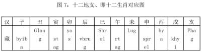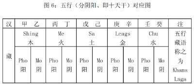 藏族称“五行”为khams—lmga;就是shing(木)、me(火)、Sa(土)、Lcags(铁=金属、金)、Chu(水)②。又各自分为阴阳(pho—mo,请注意:藏族语言习惯,阳在前而阴在后。即阳阴),合计为十,用以对应十天干③。再与十二地支,即十二生肖相配(这十二生肖的名称、位序也是和汉地一致的,称之为Lo—rtags bcu—gnyis)。下面就是汉藏两种文字的干支对照表: