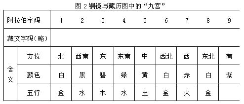 在“护身铜镜”和“藏历图”中心场有一“三三幻方”(magic square),藏语称为“九宫”(Pho—brang dgu—glign),或又根据苯教说法称为“九痣”(Sme—badgu)③,在正方形的九格内填以藏式字码1—9,而这九个字码分别代表了方位、五行、颜色等等④。如图2: