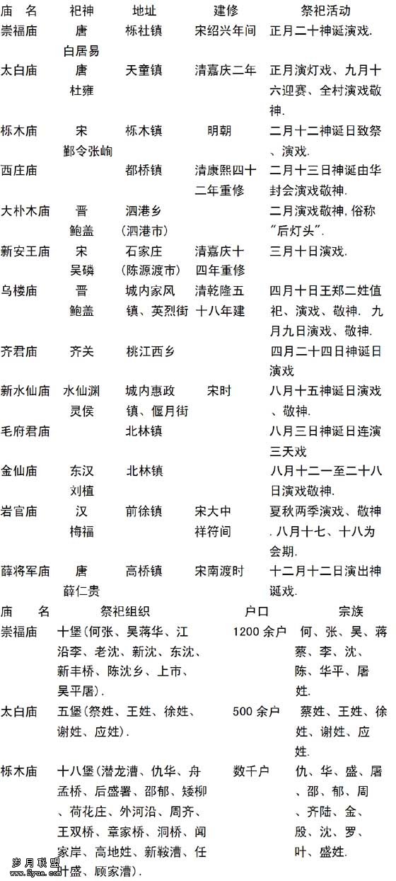 市镇乡族联合自治组织的核心事务是各姓各族共同的祭祀,多由参加在内的各姓各族出田出钱,轮流值年,同时取得该联合组织中相应的权利和义务。共同祭祀之外,这些组织兼而负责各市镇治安联防、协调各宗族利益冲突、整肃当地教化风俗等。如双林镇志有一吴总管祠,本为吴氏宗祠,祀吴氏始祖元朝巡检吴宪卿,后其六世孙改建,扩为祠堂,前建大殿奉本境土地夏禹之神,乾隆四十八年(1783)裔孙吴焕勋为首重修翻新,因其曾被推为乡约长,“于是额为‘乡约所’”,每年2月2日有“社会”。双林镇志记载中,除各个总管庙、总管堂、土地庙、佛道庙观、先贤祠堂外,定期举行社会、“百戏杂陈”、最热闹、规模也最大的东岳庙,“兼司乡约所”,或许是该镇联合自治的乡族组织之一(注:民国《双林镇志》卷15,《风俗》。)。下表编自[日]田仲一成《的宗族与戏剧》中所列“浙江鄞县市场地戏剧表”,从中可见这类组织的情况。