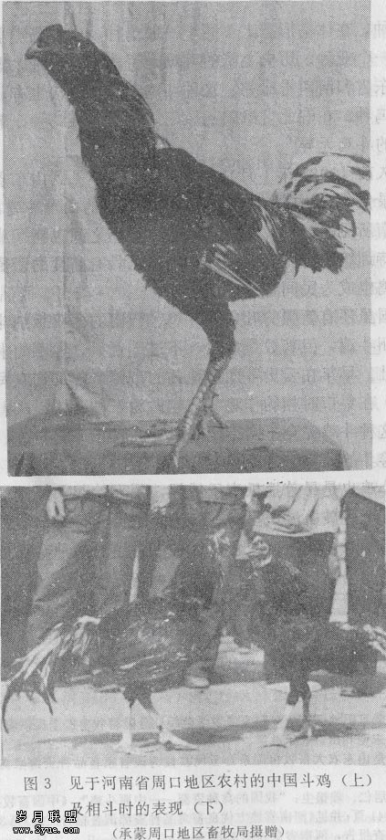 我国至今仍有少数见于黄淮平原地区。1975年笔者在去黄泛农场等地访问之便,终于了解这一历史之迷。从河南省许昌以东的,见到农民所养的鸡群,其中就有少数形态特殊的斗鸡,当地俗称“打鸡”(见图3),经过调查了解,在周口市斗鸡更为集中,而且向来有民间的斗鸡会,往年大多由一批有闲阶级作为赌博的工具,近年来又恢复这样的集会活动,不过性质变为节日的娱乐。在1970年前后,尚盛行一时;在陇海铁路沿线及开封市以南地区也散见这种斗鸡。今在河南省存在的斗鸡,肯定是我国历史上的斗鸡遗种,在体格形态上不同于一般鸡种,应在分类学上有别于鸡种的一个亚种。历史上指的鶤鸡是否就是这一种,固然难于断定;山东省和河南省毗邻,这种斗鸡必然在古代也有,鲁西一带尚有此鸡种。在