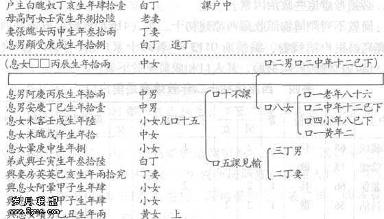 西魏大統十三年的簿册分為兩類,甲類登記户數及徵課的口數(即丁),乙類登記每户成員及受田。[58]甲類户二十七,丁六十八;乙類产九,丁二十一(剔除婢一人)。平均每户的丁數分别為2.5及2.3。前引西凉建初十二年户籍八户十八丁,每户只2.25丁。故一般估計每户大概有2.4丁。我們如果用這些簿册的户丁資料來探討南北朝末年的家庭,對其結構將有更清楚的認識。隋文帝代周後,立刻“令州縣大索貌閱”,《隋書·食貨志》曰:“於是計帳進四十四萬三千丁,新附一百六十四萬一千五百口。”每户以2.43丁計,得隱民十八萬三百零五户,則每产有九口。這數據容有誤差,似不可能太偏高。隋朝建國前夕,隱漏户口的下層民家每家竟有八、九口之多。當有不少兄弟同居,甚至已婚依然同居的家庭。