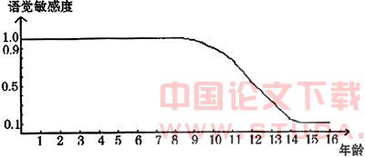 从上图不难看出,“语觉敏感度曲线”比伦内伯格的“语言发展关键期”(2~12岁)的描述更为翔实。儿童语言发展的关键期不是呈现水平状态的,儿童语言获得的最佳敏感期是在8岁以前,从9岁以后开始下降,到12岁下降到1/2左右,到14岁则下降到1/10左右,已经进入了儿童语言发展的末期,而且在8~12岁的学龄阶段,他们的语觉敏感度随年岁增加而迅速下降。