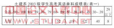 经过一个学期的学习,学生已慢慢地适应了大学生活,调整了学习方法,期末考试的成绩比高考入学时有所提高,但存在的问题还是不少。土建系2003级一年级上学期英语期末考试成绩如表三。
