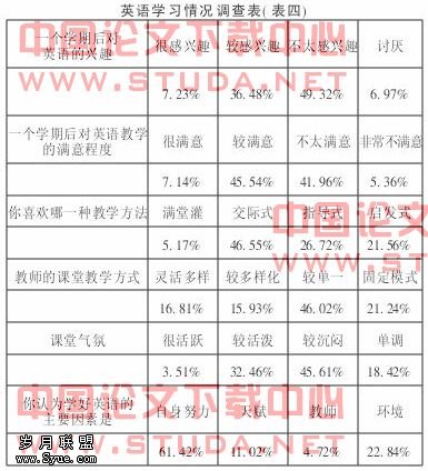 调查结果表明一个学期后学生对英语的兴趣反而是下降了,而且将近一半的学生对英语教学不太满意。究其原因,一是教师的课堂教学方式较单一,二是课堂气氛较沉闷。大部分学生喜欢的是交际式的教学方法,将近2/3的学生认为学好英语要靠自身努力。