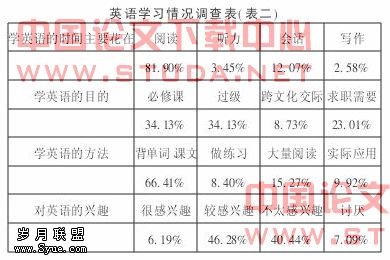 为了达到教学目标,在教学过程中,教师可以通过各种途径,尽快地对所教班级的学生有比较清楚的了解,摸清学生的英语水平,尽可能对学生的性格特点也有所了解,以便更好地采取相应的教学方法。而且,教师一开始接任某个班级的英语课,应该先给学生讲清楚英语对他们的重要性,引起学生思想上的重视,还应让学生明白,学英语是一件长期的、艰苦的任务,不花时间和精力是不可能学好的。入学半学期后我们对土建系2003级的学生进行了问卷调查,结果如表二。