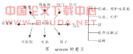 词义延伸在英语学习中,我们经常发现有些英语词汇可以有不同的喻义,作为修辞手段之一的隐喻给词汇带来了新的喻义。词汇的变化过程与人类的认知过程是紧密联系在一起的。如menu的原意为(餐馆里的)菜单,现在可用来指代电脑上的菜单。bar可能是“酒吧”、“格栅”或“障碍”,也可能是“沙洲”、“法庭”,或者是一“小节”乐曲。同样channel可能是名词,意思是“频道”或者“海峡”,但它也可能是动词,意思是“在某物上形成槽或沟”,或者“引导”。apple(苹果)在短语the apple in sb’s eye中apple延伸为心爱的人或物。babble(作咿呀语)在the babbling river延伸义为流水的潺潺声。be in the bag,此处的bag不是指包,而是包的隐喻义,短语意为如探囊取物。词汇的演变方式在英语中很常见。仅以screen一词为例,根据Oxford Advanced Learner’s English-Chinese Dictionary(第四版)所列意义如下图所示。介词的隐喻意义在英语词汇中也极为明显。以介词beyond为例,beyond的字面意义表示某物在某地或另一物的另一面,其物理意义转移到隐喻意义,则根据不同的语境而获得不同的动词含义。[2]如例1~6 所示:(1)The new housing estate stretches beyond the playing-fields.新的住宅区一直延伸到游乐场的另一边。(2)It won’t go on beyond midnight.这不会持续到午夜以后。(3)The bicycle is beyond repair.这辆自行车已经不能修理了。(4)After 25 years the town center had changed beyond recognition.25年过去了,市中心变得认不出来了。(5)I didn’t notice anything beyond his rather strange accent. 除了他那颇为古怪的口音外,我没注意到别的。(6)How people design computer games is beyond me.我不明白电脑游戏是怎么设计出来的。
