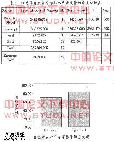 实验结果对测试成绩用SPSS软件进行方差分析。其中写作的自主学习意识水平为自变量,写作的成绩为因变量。α值设为.05。如方差分析表的结果显示:总体来说,写作自主学习意识强的学生英语写作的学习效果与写作自主学习意识弱的学生英语写作的学习效果相比具有显著性差异,[F(1,58)=19.989,P<.001]。