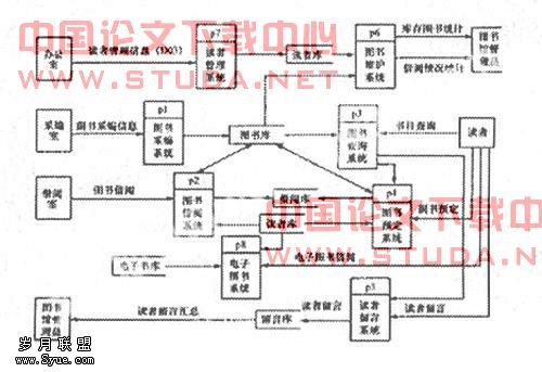 很多课件中要用到图表,比如数据流程图、决策树、E-R图等。制作这些图表,用Word不够用,Photoshop不专业,操作也复杂,专业的绘图工具Microsoft Office Visio又过于繁杂。而CorelDraw12则摒弃了上述软件的不足,提供了诸多图表绘制的功能,如各种曲线和形状绘制工具等,同时还加强了某些功能。比如说填色,可以给图表填充不同的颜色或图样。CorelDraw12除了单色填充以外,还有渐变色填充、PostScript填充、图样填充等多种填充方式。其中图样填充方式中,可以自定义所需的图样,极大地方便了图表面状要素的绘制。下图是以图书馆业务流程为模板制作的数据流程图。