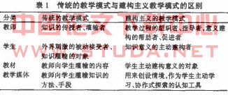建构主义理论是由瑞士心家皮亚杰提出的学习理论。这一理论认为,知识不是通过教师传授得到的,而是学习者在一定的情境下,借助他人(包括教师和学习伙伴)的帮助,利用必要的学习资料,通过意义建构的方式获得的川。因此,情境、协作、会话和意义建构是学习环境中的四大要素。建构主义提倡在教师指导下以学习者为中心的学习,教师是意义建构的帮助者、促进者,而不是知识的传授者与灌输者。学生是信息加工的主体,是意义的主动建构者,而不是外部刺激的被动接受者和被灌输的对象。建构主义学习理论既强调学习者的主体认知作用,又不忽视教师的指导作用。传统的教学模式与建构主义的教学模式的区别见表1。