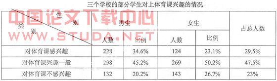 从上表的调查分析可知:对体育感兴趣的比例接近三分之一,而且男生多于女生,这说明我校的学生对体育课的的兴趣还是很浓厚的,这对学生体育工作的开展以及新课程改革很有帮助,不过还有23%的学生对体育课不感兴趣,因此我们的工作任务还很艰巨的。影响学生体育课兴趣的原因: