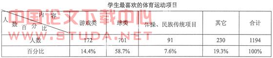 结果显示,学生们最喜欢的体育运动项目是球类,再详细分析观察,其中足球与篮球是同学们最喜欢的;其次是带有娱乐性的游戏类,这一类的学生女生占大部分。同学们最不喜欢的是田径,因为它枯燥、单调、乏味不会引起学生的兴趣。另外学生怕苦、怕累也是因素之一,这与现在大部分是独生子女有关。