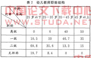 从职称结构的调查结果看(如表2所示),四个年龄组幼儿教师的职称结构也不合理,总体上具备高级和一级幼师资格的教师仅占45%,即大部分幼师属于初级职称或无职称的教师,这在一定程度上就反映出幼儿教师整体资历较低的现实。