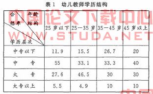 基于调查,首先分析幼儿教师的学历结构,从调查结果看(如表1所示),幼儿园教师的学历合格率(即中专以上毕业)仍然偏低。