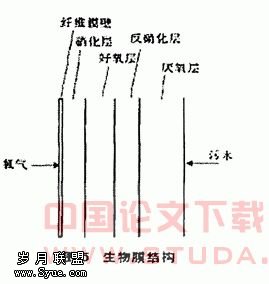 ⑦MABR反应器中气液两相分离,气体压力不受容器内混合状态的影响.因此.可以通过调节气体压力的办法来控制氧的供应。对于一般废水通过供氧控制,在保证生物膜生长需氧的同时,可以避免因过量曝气而使污水中DO浓度过高,大幅度降低运行费用。对于含氮废水,通过供氧控制只使靠近纤维膜的内层生物膜获得氧,从而达到同时硝化、反硝化和COD去除的效果Timberlak指出此时的生物膜结构如图5。