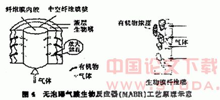 无泡曝气生物反应器(Membrane Aeration Bioiflm Reactor),简称为MABR,由中空纤维膜填料部分和水流部分组成。生物膜所需要的氧气是通过纤维束填料供给的,中空纤维膜不仅起着供氧作用,同时又是固着生物膜的载体。图 4为无泡曝气膜生物反应器处理污水原理图。即,纯氧或空气通过中空纤维膜的微孔为生物膜进行无泡曝气.在中空纤维膜的外侧形成的生物膜与污水充分接触.污水中所含的有机物被生物膜吸附和氧化分解.从而使污水得到净化。