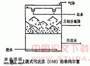 上流式污泥床(USB)是20世纪70年代末由荷兰Lettinga开发的又一项新的颗粒型生物膜反应器,主要用于厌氧生物处理系统中,即UASB。它主要由配水系统、污泥床、三相分离器等组成。反应过程中产生的气体将污泥和污水进行充分混合,三相分离器将颗粒污泥、气体和污水进行分离,污泥保留在反应器中,气体和处理后的出水排出反应器,其结构示意见图1-1。