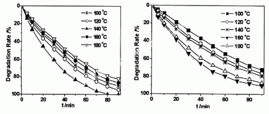 我们将反应物在所定不同温度下进行水热处理,然后在600 oC和800 oC下焙烧,其降解X-3B的结果如图2和图3。由图可见,当水热处理温度低于160 oC时,在800 oC下焙烧的TiO2的活性大大低于在600 oC下焙烧的活性。而当水热处理高于160 oC时,经800 oC焙烧制得的TiO2光催化活性大大高于在600 oC时焙烧的TiO2。表明160 oC水热处理可提高TiO2的抗晶相转变能力,制得高活性、易分离TiO2光催化剂,原因尚不清楚。进一步提高水热处理的温度,制得的TiO2光催化活性逐渐降低,可能是水热处理温度过高,晶粒长大所致[10]。所以160oC是较为适宜的水热处理温度。