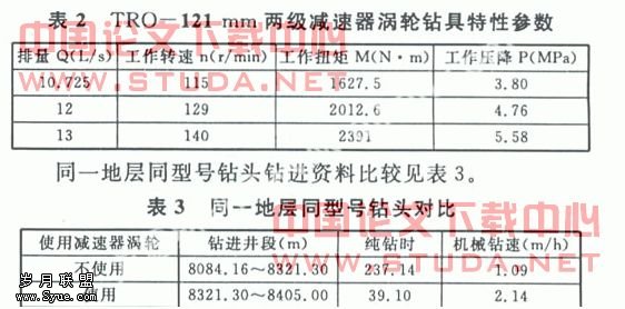 减速器涡轮钻具在国内塔深1井应用,也取得了良好的效果,2006年俄罗斯设计的7RO-121减速器涡轮钻具在塔深l井与成都BES了公司生产的M1365型PDC钻头配合使用,经过现场试验,取得了很好的技术指标,表2中列出了TRO-121减速器涡轮钻具特性参数。