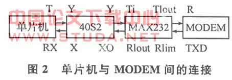 采用外置MODEM来实现拨号功能,单片机与MODEM之间采用串行通信,连接方式见图2。将电话线接入MODEM后,单片机按照RS232通信标准与MODEM相连,这里是通过MAX232芯片来实现TTL电平与RS232电平的转换,按照MODEM的工作波特率(9600bps)设置后,单片机串口发出相应AT命令可实现对MODEM的控制,同时MO-DEM在执行该命令后会返回一定的信息。返回信息对于判断MODEM是否正常工作以及电话是否拨通和被接听都有重要的作用。