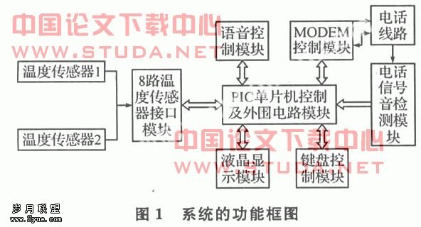 系统的主要组成部分包括:温度传感器DS18B20、PIC16F877单片机、可编程键盘/显示器接口芯片8279、OCM4X8C液晶显示器、MODEM、ISD2560语音芯片和信号音检测模块CR6230,系统的功能框图如图1所示。