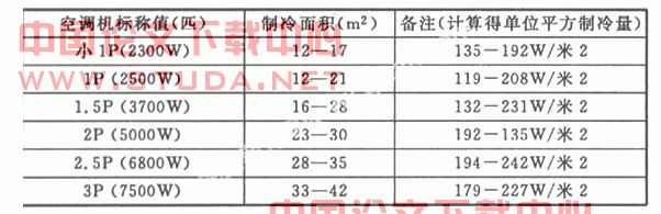 (2)在商场选择分体空调机,基本都是介绍厂家给以的标称值数据,实际是单位面积指标估算法,对于定速空调机,一般常用的冷量与面积关系为: