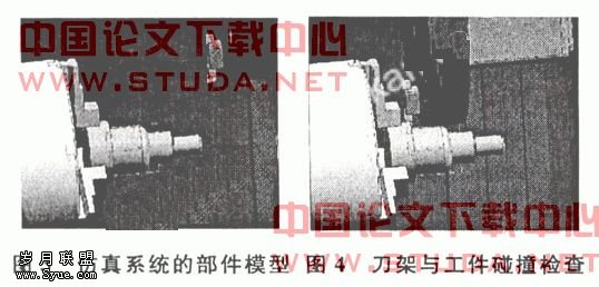 本文以UG为平台对数控车削仿真过程中的干涉检查进行了理论分析和实例验证,为了进行车削仿真过程中的干涉检查,作者建立了车床,刀具,工件和夹紧装置的三维模型,仿真过程中碰撞检查的部件模型如图3所示,分别为仿真系统中参与碰撞干涉检查的各个部件的实体模型。端而发生的碰撞,此时,系统会弹出碰撞警告消息,并且在代码显示区域显示错误的代码行,在进行外表面车削时刀具与卡盘发生碰撞的检查结果,系统同样会弹出警告消息,并且在代码显示区域显示错误的代码行。