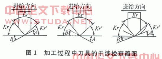 零件加工过程包括加工过程的碰撞监测和加工过程干涉碰撞检查,加工过程的碰撞监测是考虑具体的加工环境因素的影响,包括机床工作加工空间、所用夹具和加工刀具等因素,加工过程的碰撞监测可以采用区域干涉检验的方法,即在任意时刻,将切削刀具包围轮廓和静止件(机床和夹具等)包围轮廓作二维布尔运算,如有相交情况,则说明该加工位置有碰撞情况发生,对应的加工指令需要修改。进行干涉检查时需要在插值点将加工刀具主偏角和副偏角的直线倾斜角进行比较,对于圆弧段轮廓,则与该插值点在圆弧轮廓的切线的倾斜角进行比较。
